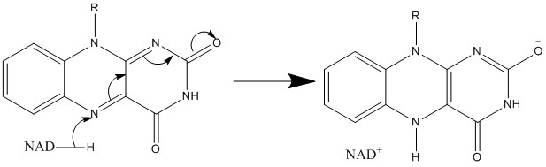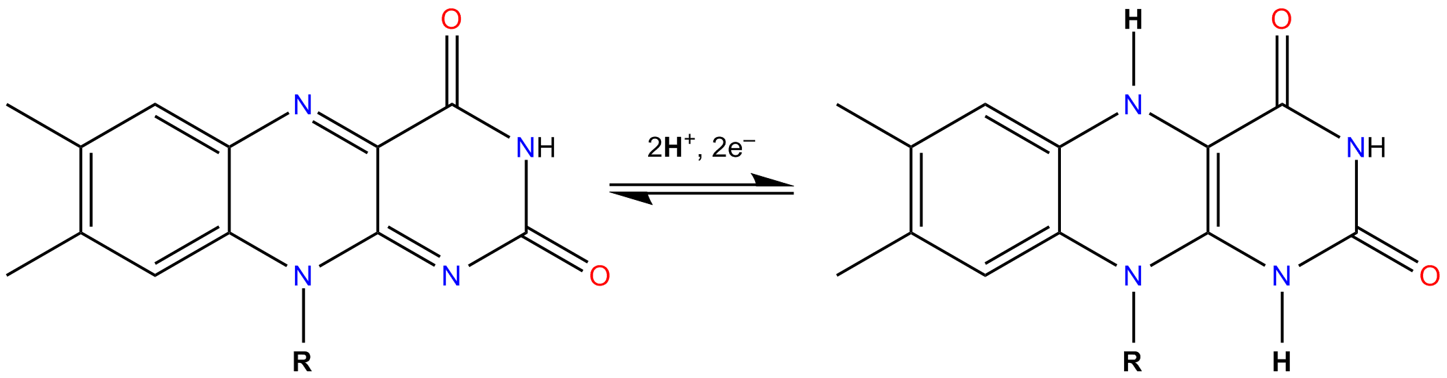 Флавины способны к обратимому восстановлению, принимая два электрона и образуя восстановленную дигидроформу: