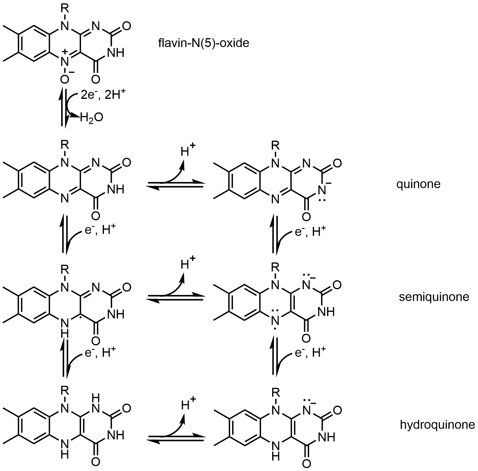 Окисление-восстановление флавинов идет в две стадии — с образованием при одноэлектронном окислении-восстановлении ион-радикальной семихинонной формы, что обуславливает участие флавинов в биохимических процессах окисления как по нуклеофильному, так и по радикальному механизмам: