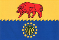 Быковский муниципальный район | 21 июля 2009[12] | 5868 | Прямоугольное полотнище с отношением ширины к длине 2:3, воспроизводящее композицию Герба района (в пересечённом бегущими влево волнами золотом и лазоревом поле вверху — червлёный идущий бык с золотым кольцом в ноздрях; внизу золотой с зеленными полосами арбуз тонко окаймлённый золотом и сопровождаемый кругом из четырнадцати золотых восьмиконечных звёзд) в красном, жёлтом, синем и зелёном цветах. | Автор — В. Э. Коваль. |