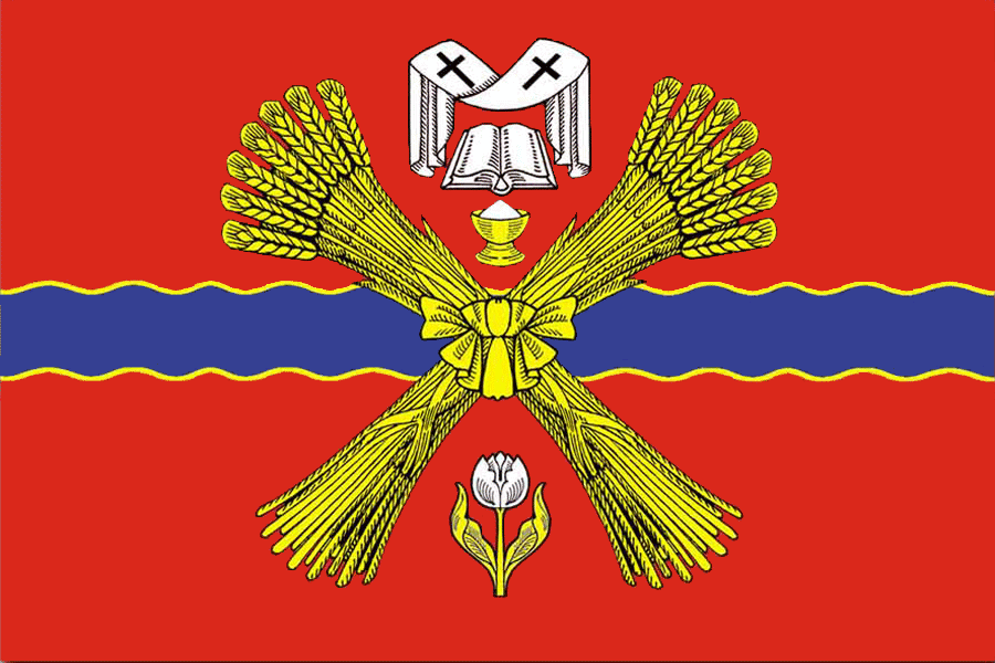 Новониколаевский муниципальный район | 30 июня 2006[30] | 2306 | Прямоугольное красное полотнище с отношением ширины к длине 2:3, несущее фигуры герба района: вдоль нижнего края голубую полосу шириной в 1/4 ширины полотнища и смещённые к древку жёлтый цветок подсолнуха с чёрными семенами и под ним жёлтый колос и белый рогоз стеблями накрест. | Авторский коллектив: