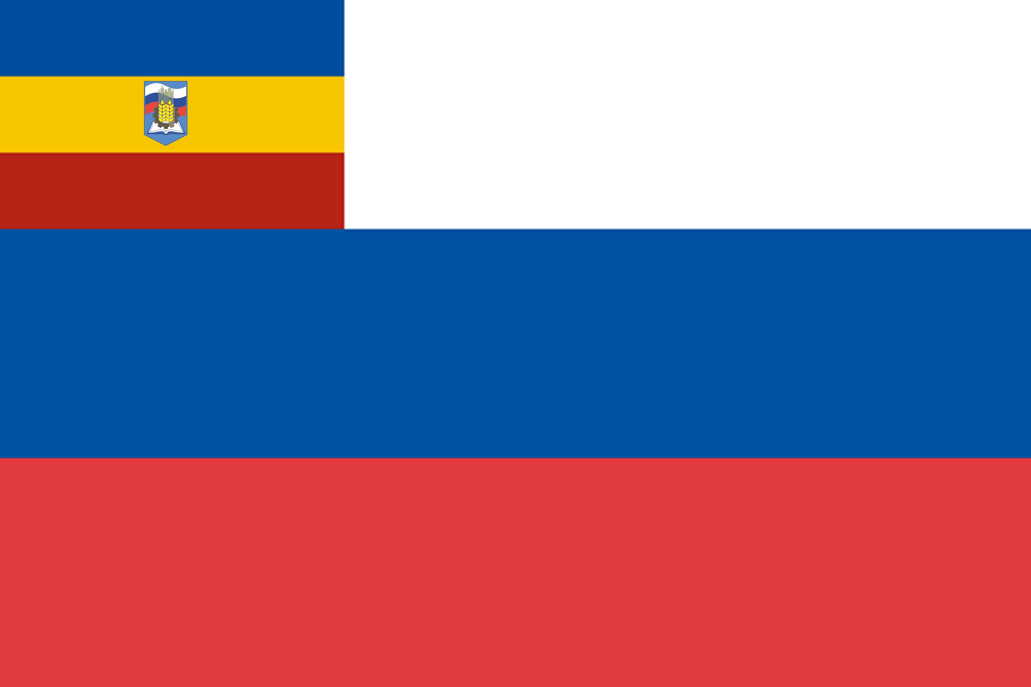 Киквидзенский муниципальный район | 11 октября 2002[21] | Не внесён | Прямоугольное полотнище с отношением ширины к длине 2:3, представляющее собой флаг Российской Федерации, в левом верхнем углу которого на 1/3 белой полосы расположен флаг Войска Донского, состоящий из трёх расположенных горизонтально полос: верхней — синего, средней — жёлтого и нижней — красного цвета. На жёлтой полосе изображён герб Киквидзенского района (четырёхугольгик, в основание которого положена раскрытая книга с переплётом синего цвета и белыми страницыми; на её фоне круг бронзового цвета с прямоугольными выступами по внешнему краю, внутри которого на белом фоне изображены два прямостоячих зерновых колоса)[22]. | |