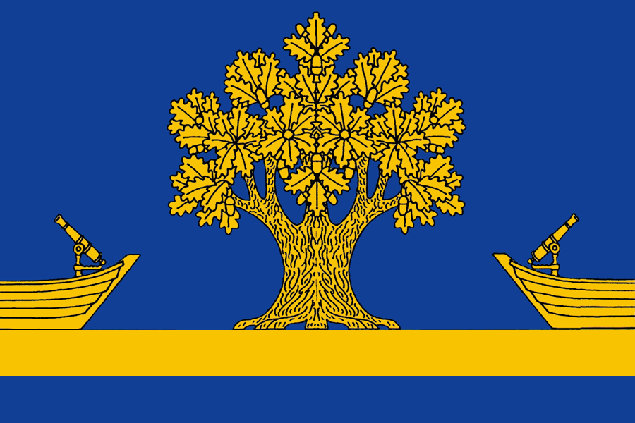 Дубовский муниципальный район | 28 июня 2007[15] | 4598 | Прямоугольное полотнище, ширина и длина которого соотносятся как 2:3, воспроизводящее композицию герба района (в лазоревом поле стоящий на пониженном узком поясе дуб, сопровождаемый двумя выходящими из-за краёв щита стоящими на том же поясе носовыми частями стругов с носовыми орудиями на них) в синем и жёлтом цветах. Ниже основания ствола дерева проходит жёлтая разделительная полоса. | Автор — В. Э. Коваль. |
