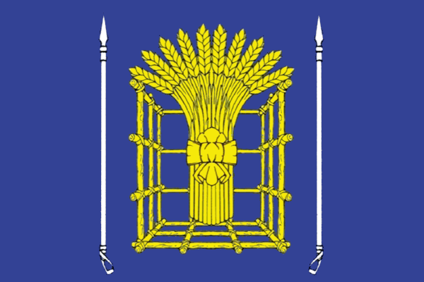 Урюпинский муниципальный район | 24 декабря 2008 (дата утверждения герба)[41] | 5680 | Синее полотнище, с изображением золотого дуба с корнями, сопровождаемого серебряным обручем, составленным из двадцати пяти восьмиконечных звёзд. Поверх дуба — серебряные сабли в червлёных ножнах накрест, поверх которых червлёный круглый щиток, широко окаймлённый серебром и обременённый золотой подковой шипами вверх, положенной на два золотых пшеничных колоска, расходящихся от основания, между ними трёхлистный серебряный крест. | Официально флаг Урюпинского района не утверждён, однако внесён в ГГР и фактически используется флаг, основанный на гербе Урюпинского района. |