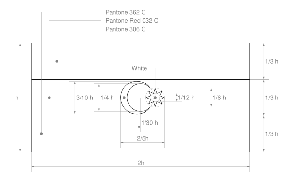 Серп и молот вписываются в квадрат, сторона которого равна 1/4 ширины флага. Острый конец серпа приходится по середине верхней стороны квадрата, рукоятки серпа и молота упираются в нижние углы квадрата. Длина молота с рукояткой составляет 3/4 диагонали квадрата. Пятиконечная звезда вписывается в окружность диаметром в 1/8 ширины флага, касающуюся середины верхней стороны квадрата. Расстояние вертикальной оси звезды, серпа и молота от древка равняется 1/3 ширины флага. Расстояние от верхней кромки флага до центра звезды 1/8 ширины флага.