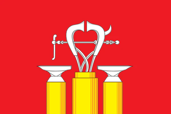 «Прямоугольное красное полотнище с отношением ширины к длине 2:3, с изображением фигур герба Александровского муниципального района: трёх жёлтых колод с тисками и двумя наковальнями на них, выполненными белым цветом, и жёлтой короны над тисками».