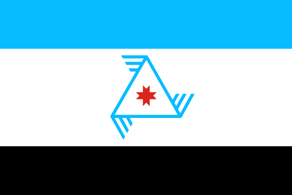 В центре — красный греческий крест с клиновидно раздвоенными плечами. Белая полоса занимает половину ширины всего флага, лазоревая и чёрная — по одной четверти. Отношение ширины флага к его длине — 2:3[2].