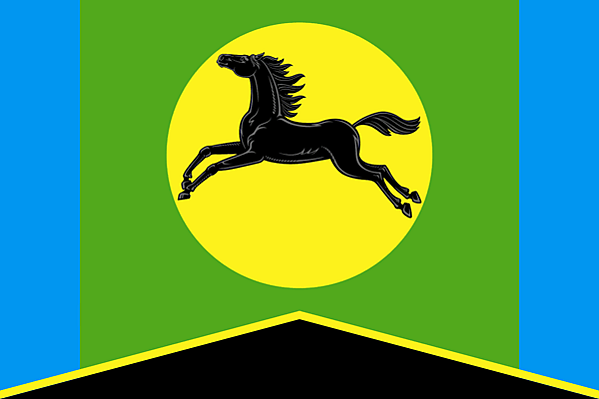 «Прямоугольное двухстороннее полотнище зелёного цвета с отношением ширины к длине 2:3, с вертикальными краями голубого цвета шириной 1/5 ширины полотнища. К нижнему краю полотнища поверх голубых краёв примыкает пирамида чёрного цвета высотой 1/5 ширины полотнища, завершённая жёлтой полосой в 1/50 ширины полотнища, а между остриём пирамиды и верхним краем полотнища изображён жёлтый круг радиусом 1/3 ширины полотнища, на котором изображена чёрным и серым цветом скачущая лошадь».