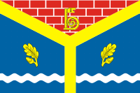 В верхней части полотнища помещён красный, мурованный белыми швами, опрокинутый равнобедренный треугольник, с основанием, совпадающим с верхним краем полотнища. Габаритная высота треугольника составляет 3/8 ширины полотнища.