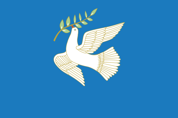 «Прямоугольное синее полотнище с соотношением ширины к длине 2:3, в центре которого летящий к древку голубь белого цвета, держащий в клюве жёлтого цвета оливковую ветвь жёлтого цвета с листьями зелёного цвета».