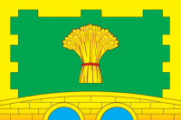 Флаг представлял собой «прямоугольное зелёное полотнище с отношением ширины к длине 2:3, несущее по периметру жёлтую кайму, вверху и по сторонам ограниченную прямоугольными зубцами (по три зелёных зубца с каждой из трёх сторон), а внизу имеющую вид каменного моста с двумя арками, выделенными голубым цветом; посередине основной части полотнища — изображение снопа, воспроизведенного жёлтым и красным цветом»[1].