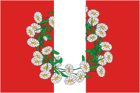 «Полотнище красного цвета с соотношением сторон 2:3, несущее посередине белую полосу в 1/3 ширины полотнища и бело-желто-зелёное изображение ромашкового венка, частично скрытого белой полосой».