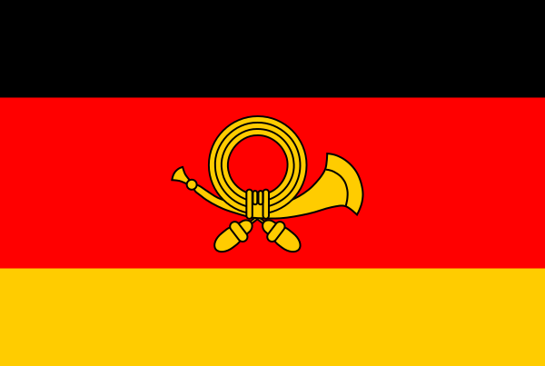 8. Флаг государственной почты (Reichspostflagge) имеет полосы, как на национальном флаге, в середине более широкой на 1/5, чем чёрная и золотисто-жёлтая полосы, красной полосы изображён жёлто-золотой почтовый рожок с золотисто-жёлтым шнуром и двумя золотисто-жёлтыми кистями, обращённый мундштуком к древку. Отношение ширины полотнища к его длине как 2 к 3.
