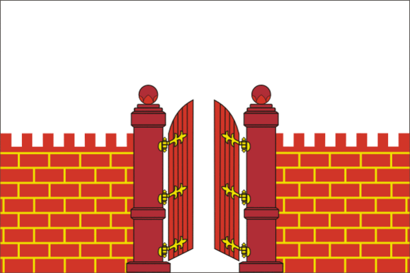 «Флаг городского поселения Верея представляет собой прямоугольное белое полотнище с отношением ширины к длине 2:3, на котором красными и жёлтыми цветами изображены зубчатая, доходящая до краёв полотнища стена с верейными столбами и полуоткрытыми воротами».