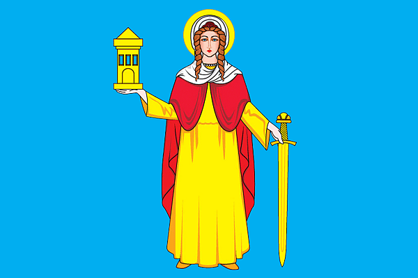 «Прямоугольное двухстороннее голубое полотнище с отношением ширины к длине 2:3, с изображением по центру святой Варвары с жёлтыми волосами, в жёлтых же обуви и платье под красным плащом, имеющая на голове и плечах белый платок; нимб жёлтый; в правой руке святая держит жёлтую башню с тремя сквозными окнами, левой опирается на жёлтый меч».