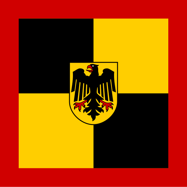 «Германский военный флаг (нем. Deutsche Kriegsflagge) состоит из трёх равных по ширине горизонтально расположенных полос: сверху — чёрная, в середине — красная, снизу — жёлтая. В крыже расположен государственный герб (нем. Reichswappen) в четырёхугольном поле, которое занимает две пятых ширины флага. Государственный герб несёт в золотом (жёлтом) поле двуглавого чёрного орла с красными языками, золотыми (жёлтыми) клювами и открытыми когтями.