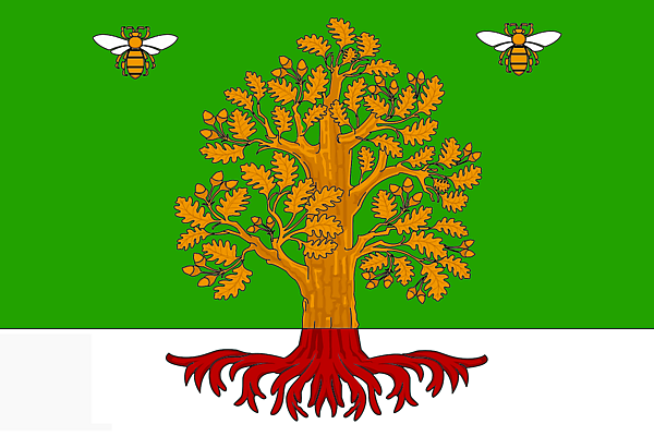 «Прямоугольное зелёное полотнище с отношением ширины к длине 2:3, несущее вдоль нижнего края белую полосу в 1/4 ширины полотнища; посередине полотнища воспроизведено жёлтое стилизованное изображение дуба с корнями; низ изображения дуба, расположенный на фоне белой полосы, имеет красный цвет. Вблизи верхнего края полотнища по сторонам от дуба расположены жёлто-белые изображения пчёл — по одной с каждой стороны».