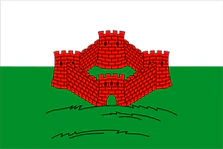 «Флаг представляет собой прямоугольное полотнище с отношением ширины к длине 2:3, состоящее из двух горизонтальных полос: белой (в 4/9 ширины полотнища) и зелёной (в 5/9 ширины) и несущее посередине изображение красной крепости с чёрными бойницами из герба города».