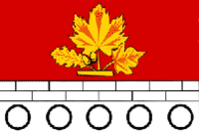 «Прямоугольное полотнище жёлтого цвета с отношением ширины к длине 2:3, несущее в крыже расположенные синий кадуцей над скрещёнными красными молотами. У свободного края треугольник в виде вертикально развёрнутой кирпичной бело-красной кладки (причём красные элементы образуют красную сломанную под углом полосу, примыкающую к краю треугольника), отделённый от основной части полотнища синей сломанной под углом полосой, несущей 15 белых звёзд (ближайшая к древку имеет больший размер)».