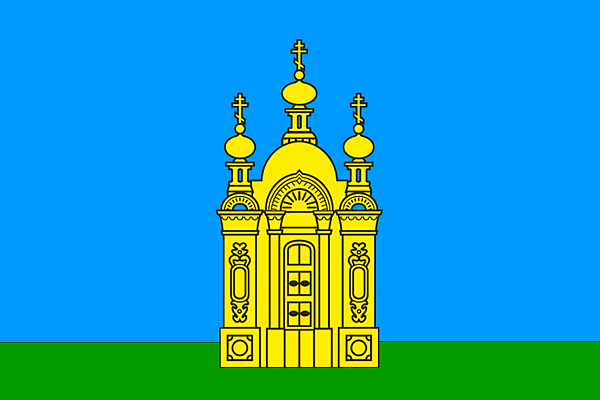 «Прямоугольное полотнище с отношением ширины к длине 2:3, разделённое по горизонтали на две неравные полосы — верхнюю синюю в 6/7 ширины полотнища и зелёную в 1/7 ширины полотнища, воспроизводящее фигуру из гербовой композиции: жёлтую часовню, по краям увенчанную двумя главками, а посредине куполом с такой же главкой наверху; на всех главках — осьмиконечные кресты».
