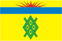 «Прямоугольное полотнище с отношением ширины к длине 2:3, жёлтого цвета с горизонтальной синей (голубой) полосой, составляющей 1/6 ширины полотнища, на расстоянии 1/6 ширины полотнища от верхнего края, несущее в центре выходящее из-за синей полосы красное изображение верхней части солнца. Под синей полосой зелёная фигура, образованная переплетёнными сквозным ромбом и узким андреевским крестом, в каждом из четырёх отверстий сопровождённая малым кружком того же цвета. Размер фигуры составляет 3/5 ширины полотнища».