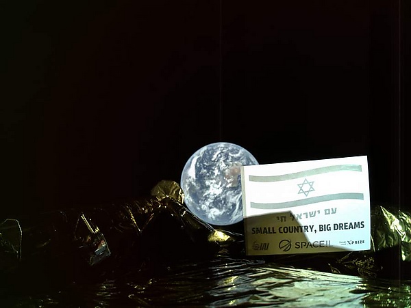 Израильский лунный аппарат «Берешит» нёс на себе флаг Израиля и сделал с ним несколько фотографий в космосе с Землёй и Луной на фоне весной 2019 года[16].