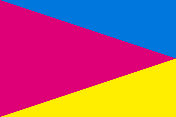 Флаг представляет собой прямоугольное полотнище с соотношением сторон 2:3, разделенное малиновым клином от верхнего и нижнего углов у древка к центру свободного края на синюю и желтую части.