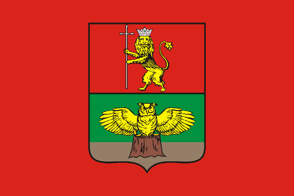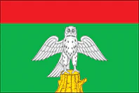 «Прямоугольное зелёное полотнище с отношением ширины к длине 2:3, несущее вдоль верхнего края красную полосу в 1/4 ширины полотнища и воспроизводящее фигуры районного герба: сову сидящую на пне, выполненные белым, серым, чёрным и жёлтым цветами».