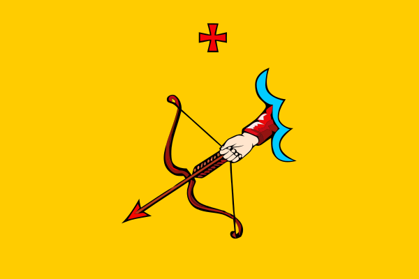 «Флаг муниципального образования „Город Киров“ представляет собой прямоугольное полотнище жёлтого цвета с отношением ширины к длине 2:3, в центре которого — направленная по диагонали вниз выходящая из схематически показанного облака синего цвета рука в рукаве красного цвета, держащая натянутый лук красного цвета с наложенной стрелой красного цвета, выше которой — уширенный крест красного цвета».