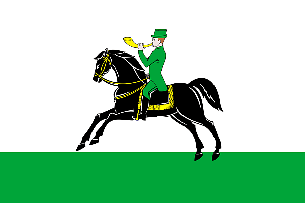 «Флаг Клинского района представляет собой белое полотнище в центре которого скачущий по зелёной земле на чёрном коне, осёдланном и взнузданном также чёрным, человек в зелёной одежде и шапке и в чёрных сапогах, трубящий в золотистый почтовый рожок».