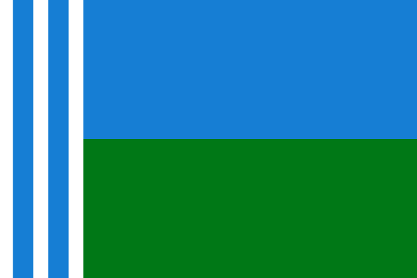 «Флаг города представляет собой прямоугольное полотнище с соотношением ширины к длине 2:3, разделённое по горизонтали на две равновеликие части — синюю и зелёную; одна пятая часть полотнища у древка выделена в виде чередующихся вертикальных полос — трёх белых и двух синих, при этом синие полосы вдвое шире белых».