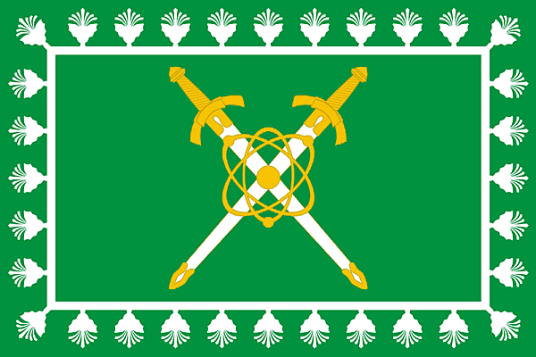 «Прямоугольное полотнище зелёного цвета с отношением ширины к длине 2:3, на котором белым и жёлтым цветами воспроизведены фигуры городского герба (скрещённые мечи, украшенная сосновыми шишками внутренняя кайма и знак атома). Обратная сторона аналогична лицевой».