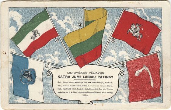 Образ литовского национального флага формировался в 1917—1918 годах с учётом традиций геральдики и литовского народного декоративно-прикладного искусства. Комиссию, выработавшую проект литовского флага, составили учёный и общественный деятель Йонас Басанавичюс, художник Антанас Жмуйдзинавичюс и археолог, краевед, художник Тадас Даугирдас. Й. Басанавичюс предложил использовать цвета, чаще других встречающиеся в литовском народном текстиле. Руководствуясь этим предложением, художник А. Жмуйдзинавичюс подготовил проект с полосами красного и зелёного цветов, чаще других встречающихся в народных тканях. По предложению Т. Даугирдаса была введена полоса жёлтого цвета, символизирующего зарю. Жёлто-зелёно-красный триколор был утверждён Советом Литвы 19 апреля 1918 как временный флаг Литвы.