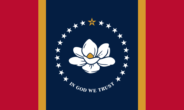 Флаг Миссиси́пи (англ. Flag of Mississippi) — один из государственных символов американского штата Миссисипи. На флаге изображены белый цветок магнолии и слова «In God We Trust» (с англ. — «На Бога уповаем») на красном поле с синей вертикальной полосой в центре с золотыми краями. Флаг был выбран Комиссией по изменению дизайна флага Миссисипи и одобрен на референдуме 3 ноября 2020 года. 6 января 2021 года флаг был утверждён парламентом штата, и 11 января он стал официальным[2][3][4]. Он заменил предыдущий флаг, на котором в верхнем левом углу располагалось боевое знамя Конфедеративных Штатов Америки и который был упразднён 30 июня 2020 года[5].