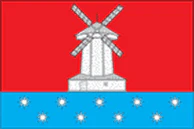 «Прямоугольное полотнище красного цвета с отношением ширины к длине 2:3, несущее вдоль нижнего края полосу голубого цвета шириной 2/7 ширины полотнища. На основной, красной части полотнища, вплотную к синей полосе расположено белое, со светло-серыми деталями, изображение ветряной мельницы; на полосе, со смещением к центру, изображены в два ряда девять белых восьмилучевых звёзд (пять и четыре)».