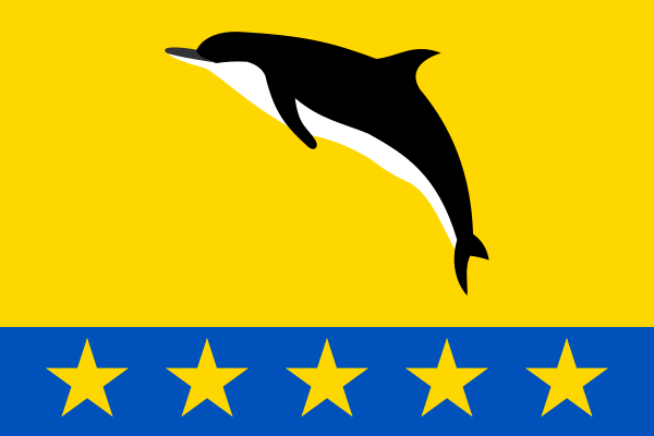 «Полотнище жёлтого цвета с отношением ширины к длине 2:3, несущее вдоль нижнего края синюю полосу в 1/4 ширины полотнища. Основная часть полотнища несёт изображение чёрного с белыми элементами дельфина; на полосе воспроизведены пять жёлтых пятилучевых звёзд».