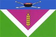«Полотнище с соотношением сторон 2:3, несущее вдоль верхнего края синюю (голубую) полосу в 1/4 ширины полотнища и вплотную к ней — малиновый равнобедренный треугольник, отходящий к нижнему краю и окаймлённый с двух равных сторон белой полосой, шириной в 1/8 ширины полотнища. Оставшиеся участки полотнища, по совокупной площади равные треугольнику (с окаймлением), имеют зелёный цвет.