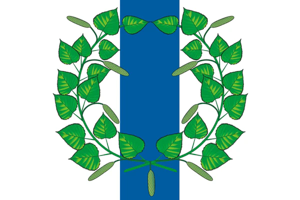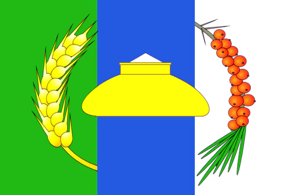 «Прямоугольное полотнище, разделённое по вертикали на три равных полосы: первую — зелёного цвета, несущую изображение жёлтого, дугообразно положенного колоса; вторую — синего цвета, несущую в середине изображение жёлтого каравая с солонкой и третью — белого цвета, несущую изображение зелёной ветки облепихи с плодами оранжевого цвета, положенную дугообразно концом вниз.