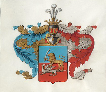 Геральдическое описание герба гласит: «В червлёном (красном) поле — стоящий на серебряном змии золотой лев с золотым языком, держащий золотую саблю в поднятой правой передней лапе».