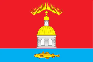 «Прямоугольное красное полотнище с отношением ширины к длине 2:3, с голубой полосой вдоль нижнего края (шириной в 2/9 ширины полотнища), по середине полосы изображена жёлтая треска, в красной части — часовня из герба поселения выполненная белым и жёлтым цветом и сопровождённая вверху жёлтым стилизованным северным сиянием».