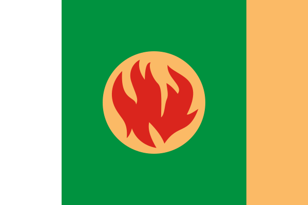 «Флаг представляет собой прямоугольное полотнище с соотношением сторон 2:3. В центральной части флага расположено зелёное поле, занимающее 3/5 длины полотнища. В центре зелёного поля — светло-охристый диск, обременённый красным пламенем. Отношение диаметра диска к длине полотнища составляет 1/2. По боковым краям полотнища расположены две равные по ширине полосы, белая вдоль древка и светло-охристая с противоположного края, занимающие 1/5 длины полотнища».