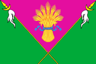 «Полотнище зелёного цвета с соотношением сторон 2:3, несущее вплотную к верхнему краю малиновый треугольник одним углом вниз, на котором изображён жёлтый сноп с синей лентой; поверх границ треугольника и зелёной части полотнища воспроизведены бело-жёлтые изображения бунчуков, скрещённые внизу и касающиеся верхнего и нижнего краёв полотнища».