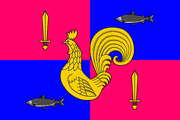 Геральдическое описание герба гласит: «В разбитом начетверо пурпурном и лазоревом (синем, голубом) поле золотой петух без видимых лап, с хвостом наподобие одной большой бегущей волны, гребень которой закручен в бездну, раскрывающийся по ходу солнца, сопровождаемый в каждой пурпурной четверти золотым обнажённым мечом в столб рукоятью вниз, в каждой лазоревой четверти — серебряной рыбой в пояс».