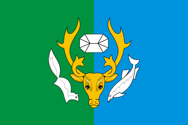 Голубой цвет и рыба показывают то, что муниципальное образование расположено на берегах северных рек, богатых рыбой.