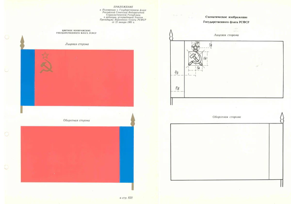 …Статья 181. Государственный флаг Российской Советской Федеративной Социалистической Республики представляет собой красное прямоугольное полотнище со светло-синей полосой у древка во всю ширину флага, которая составляет одну восьмую длины флага. В левом верхнем углу красного полотнища изображены золотые серп и молот и над ними красная пятиконечная звезда, обрамлённая золотой каймой. Отношение ширины флага к его длине — 1:2[19].