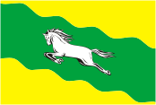 «Прямоугольное жёлтое полотнище с отношением ширины к длине 2:3, несущее посередине косой широкой (1/2 ширины) волнообразной полосы от верхнего угла, фигуру белого скачущего коня».
