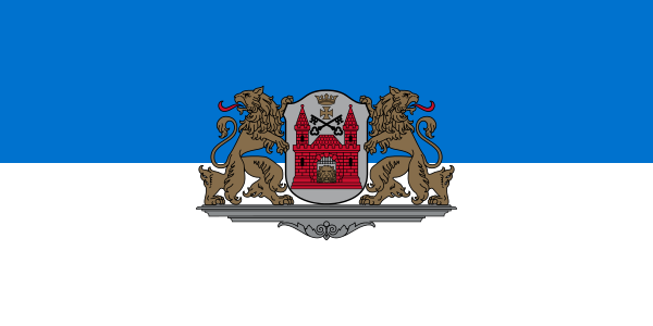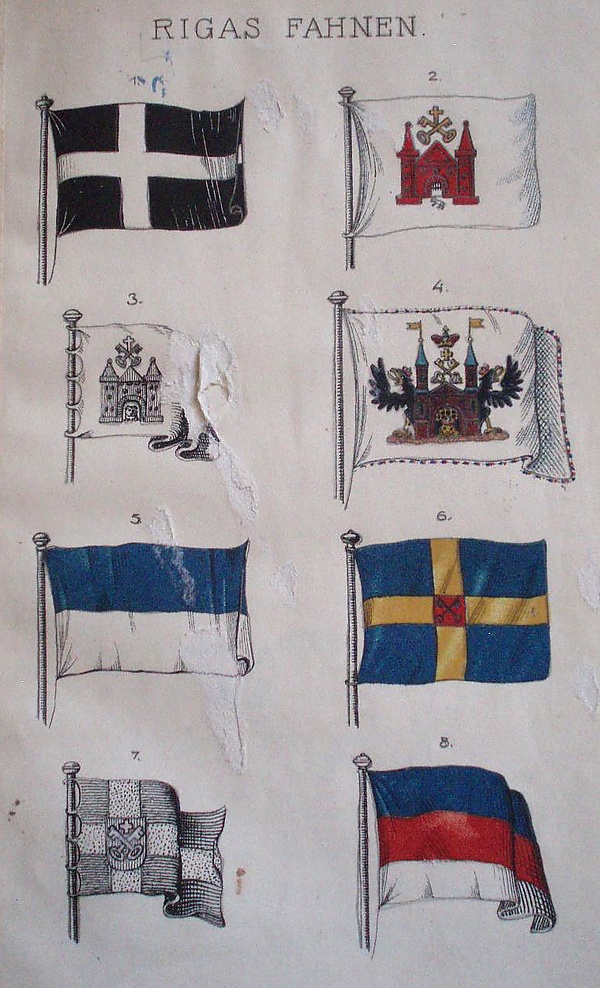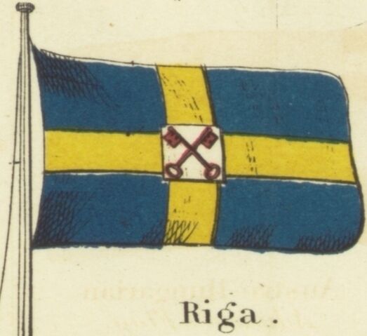 После 1582 года флаг Риги был белым с красным городским гербом, пока в середине XVII столетия, благодаря героизму жителей города в борьбе с войсками Московского государства, король Швеции не пожаловал Риге свои королевские цвета: голубой флаг с жёлтым крестом, в центре которого — красный щит с двумя скрещенными ключами. Этот флаг использовался до 1860 года[1][2].