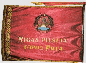 Во времена Латвийской ССР знамя Риги представляло собой красное полотнище, на одной стороне которого был изображён профиль Ленина и слоган «Пролетарии всех стран, соединяйтесь!» на латышском языке, а на другой — герб республики и название города. Флаг также украшал стилизованный национальный латышский орнамент. 26 ноября 1970 года Риге вместе со знаменем был вручен и орден Ленина.