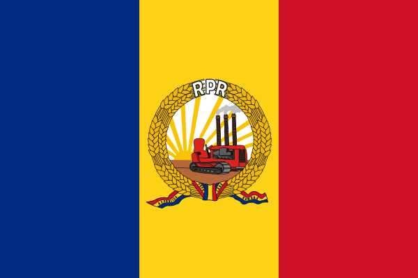 В социалистический период (с 1947 по 1965 год страна называлась Румынская Народная Республика, а с 1965 по 1989 — Социалистическая Республика Румыния) флаг состоял из красной, жёлтой и синей полос, расположенных вертикально, с синей полосой у древка. В середине располагался герб Румынии. Отношение сторон флага 2:3.