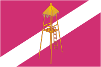 «Прямоугольное малиновое полотнище с отношением ширины к длине 2:3, несущее косую широкую (1/4 ширины полотнища) белую полосу от верхнего угла, поверх которой воспроизведена сторожевая казачья вышка жёлтого цвета».