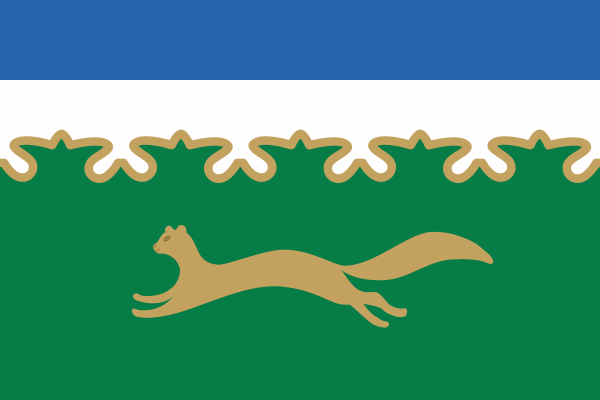«Прямоугольное полотнище с соотношением ширины к длине 2:3, состоящее из трёх горизонтальных полос: верхней синего цвета, средней белого цвета (каждая шириной 1/5 ширины полотнища) и нижней зелёного цвета (зелёная полоса переходит в белую с башкирским орнаментом, подобным чередующимся росткам в три листа и малым остриям); в центре зелёной полосы бегущая к древку куница жёлтого цвета».[1]